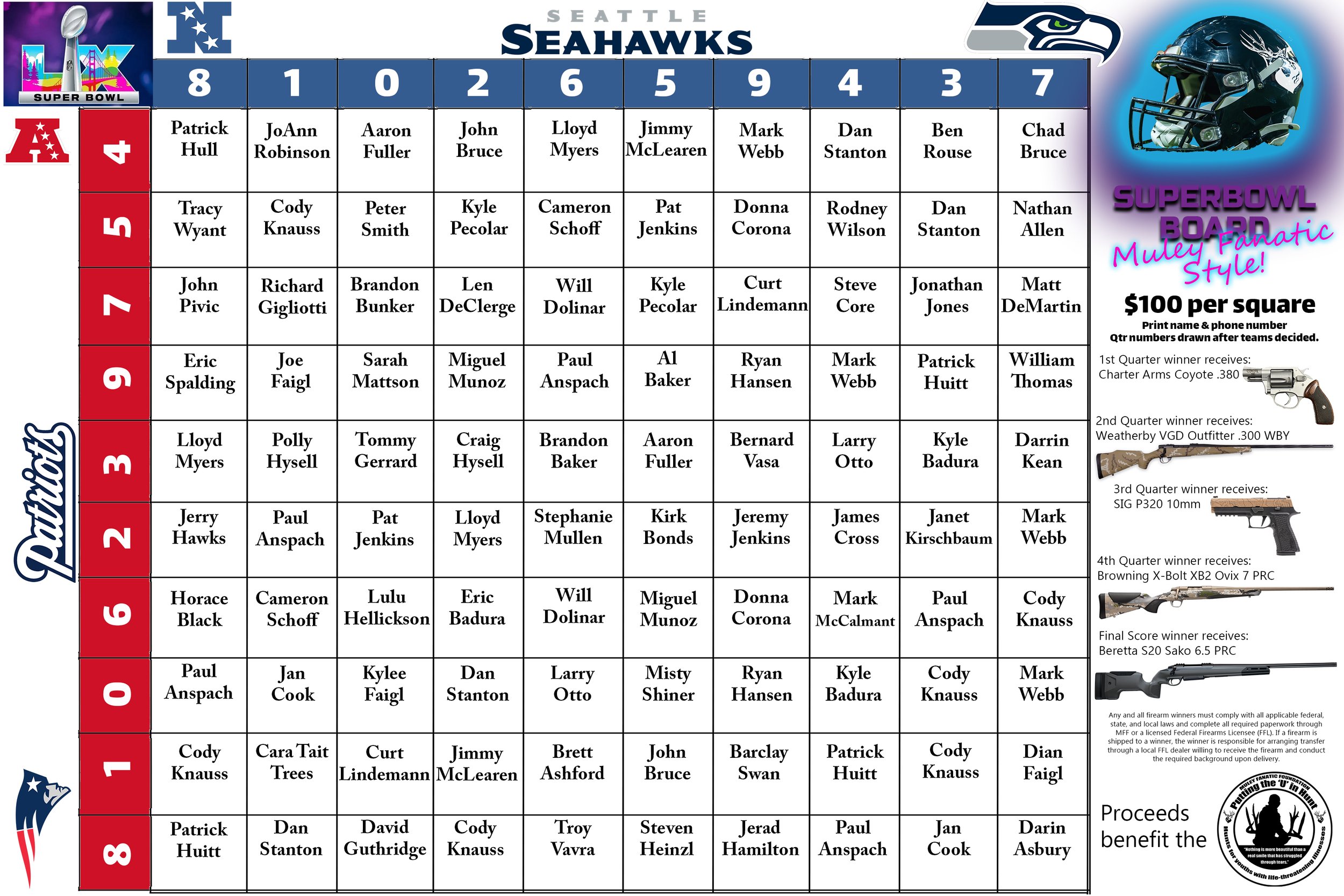 Final layout of this year’s Super Bowl LX board Muley Fanatic style. Proceeds to benefit the Putting the ‘U’ in Hunt program. Thank you all for the support and good luck!